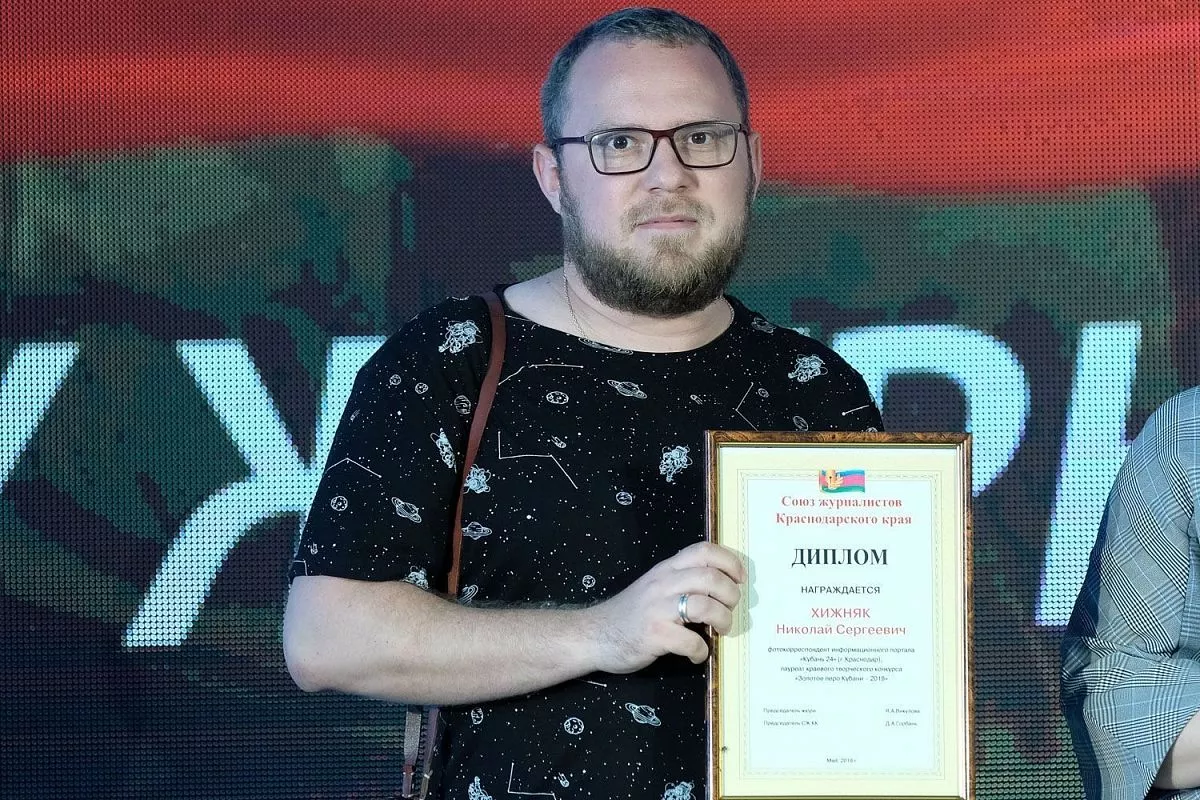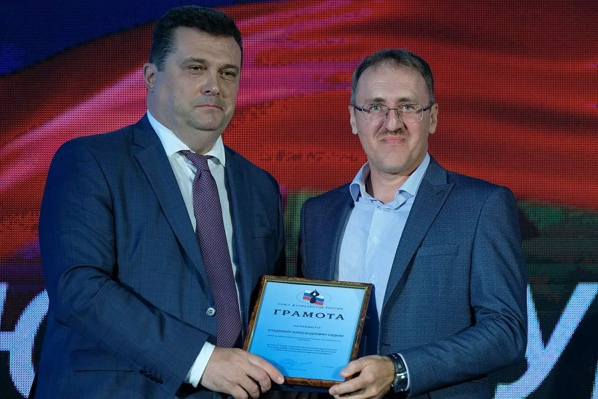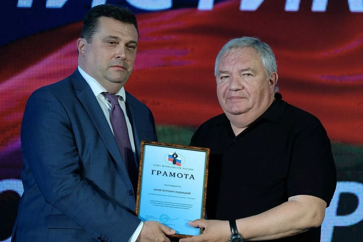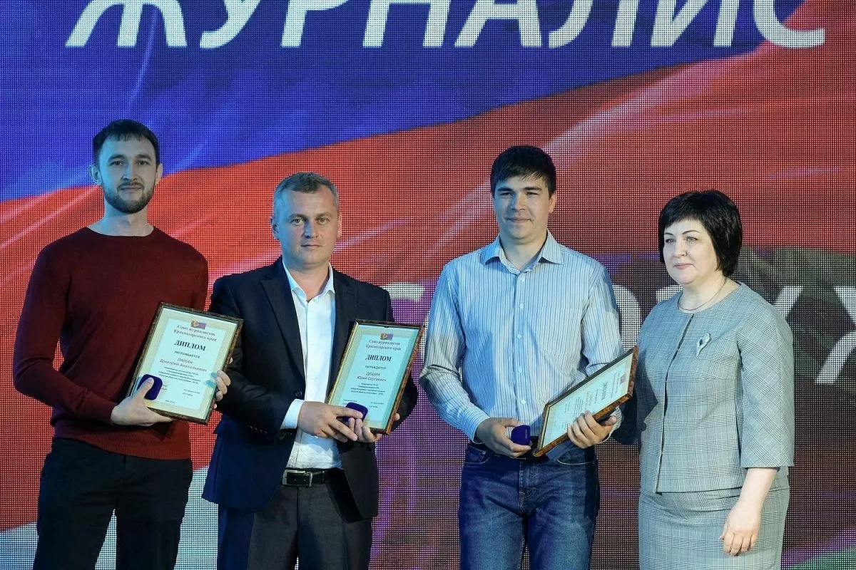 Почетными грамотами Союза журналистов России Владимир Соловьев наградил первого заместителя генерального директора «Кубанских новостей» Яну Викулова и старшего фотокорреспондента газеты Юрия Ходзицкого.