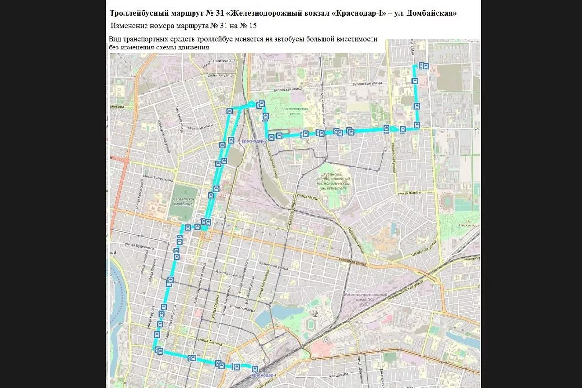 На маршрутах № 9 «Автовокзал «Южный» – Бальнеолечебница» и № 31 «Железнодорожный вокзал «Краснодар-I» – ул. Домбайская» троллейбусы заменят на автобусы большой вместимости, в дальнейшем – на электробусы.