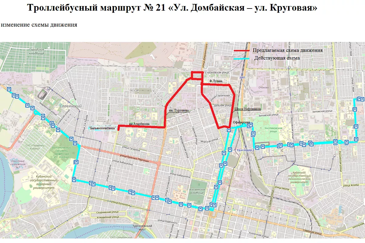 Троллейбусы №21 «Ул. Домбайская – ул. Круговая» также пойдут в обход ул.Красной – по ул. Шоссе Нефтяников, им. Фёдора Лузана, Стахановская, им. Тургенева, им. Атарбекова, им. Герцена до остановки «Бальнеолечебница». Обратно от остановки «Бальнеолечебница» по ул. им. Герцена, им. Атарбекова, им. Тургенева, им. Дзержинского, Офицерская и далее по маршруту до ул. Домбайской.