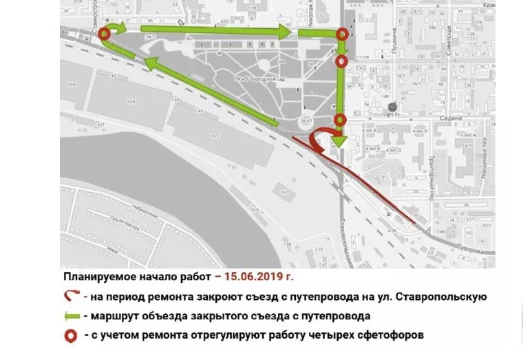 На время ремонта закроют съезд с путепровода на улицу Ставропольскую при движении из города. Попасть на Ставропольскую можно будет, свернув с Суворова на Захарова, затем — на Постовую и по ней выехать на Ставропольскую.