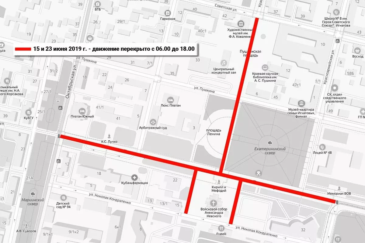 с 14.00 28 июня до 01.00 29 июня по ул. Красной — от ул. Советской до ул. им. Кондратенко; по ул. Постовой — от ул. им. Захарова до ул. Октябрьской; по проездам с западной и восточной сторон Войскового собора благоверного князя Александра Невского, между ул. Красной и ул. им. Николая Кондратенко.
