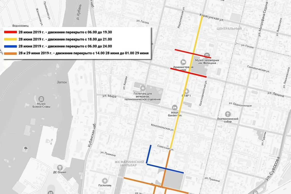 с 06.00 28 июня до 01.00 29 июня — ул. Красной — от ул. Карасунской до ул. им. Николая Кондратенко;