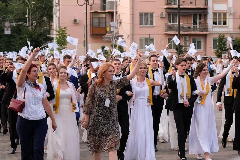 Этот праздничный вечер для лучших кубанских выпускников, отличников, волонтеров, победителей и призеров олимпиад, творческих конкурсов, спортивных соревнований начался с торжественного шествия по главной улице города от сквера им. Георгия Жукова до площади перед зданием Законодательного Собрания Краснодарского края.