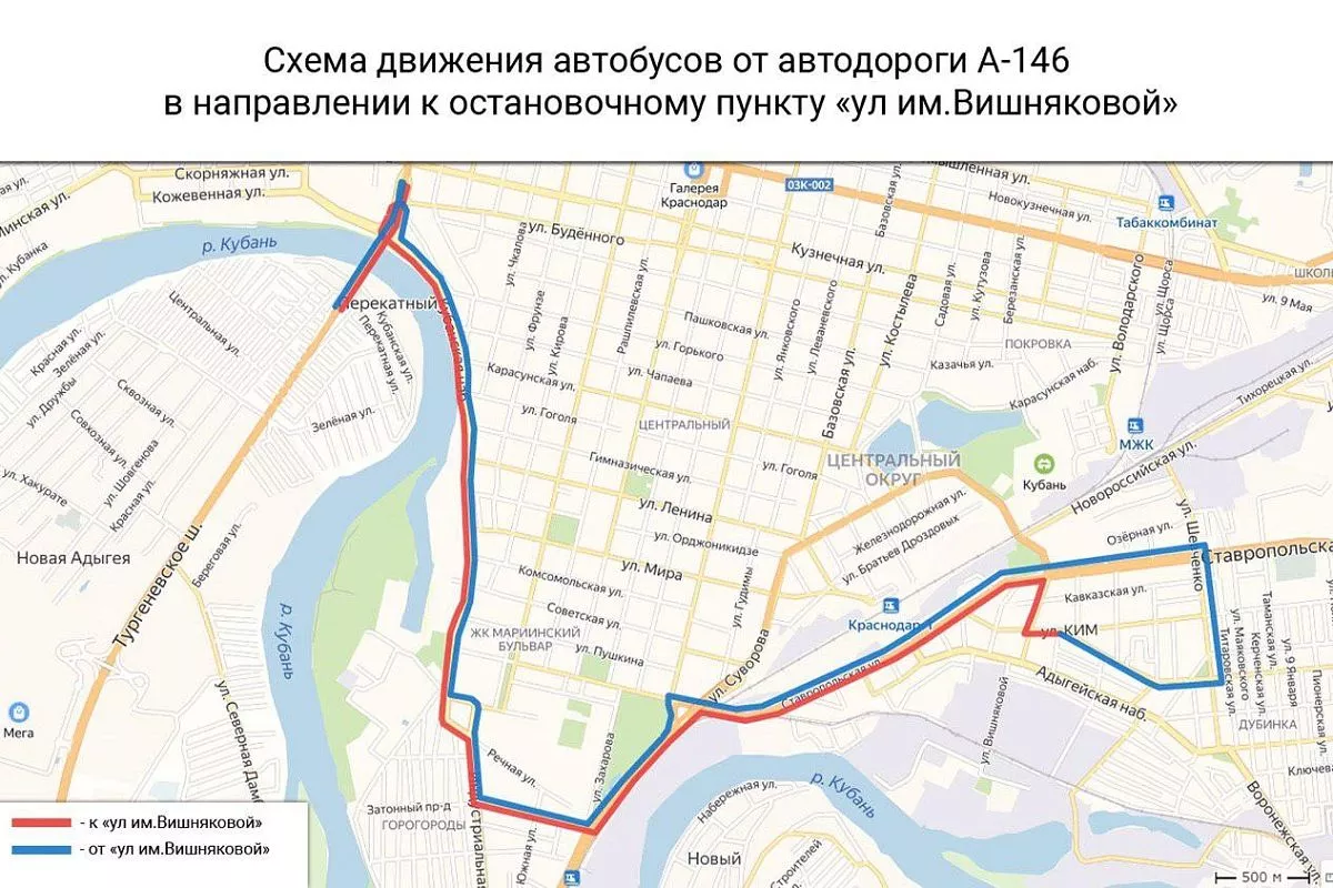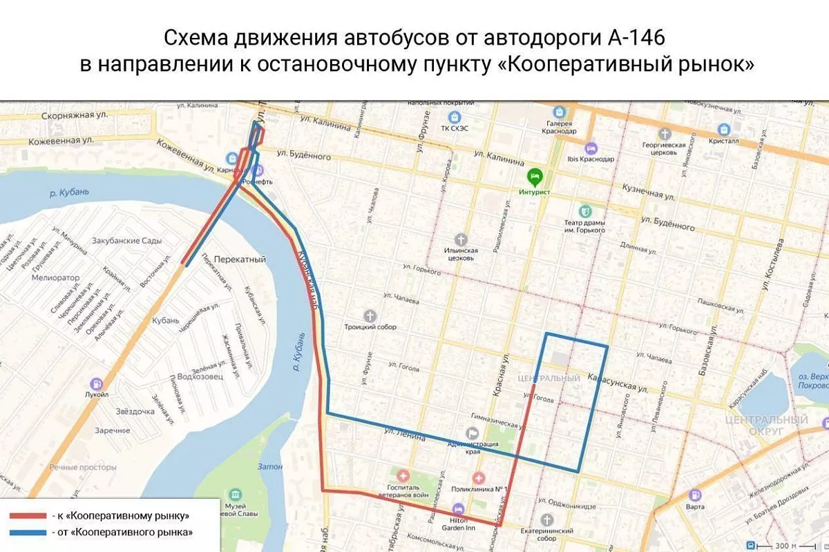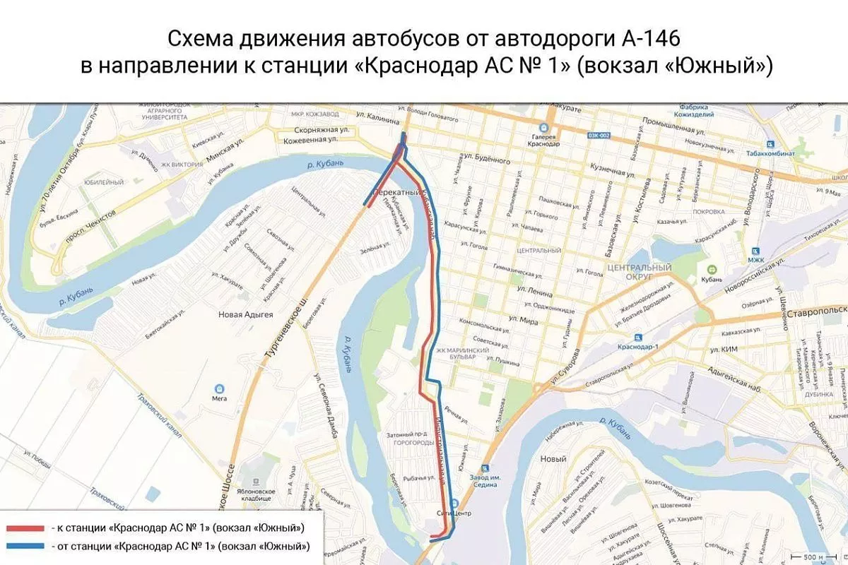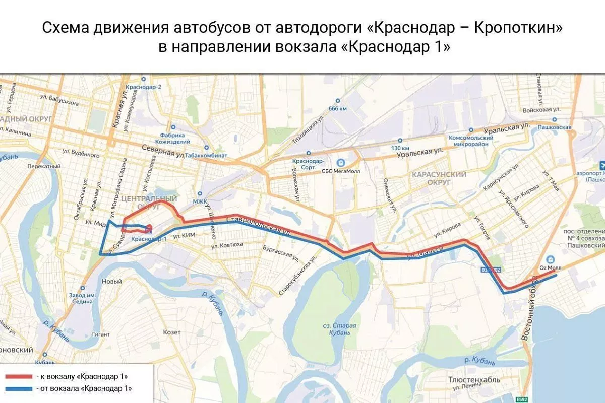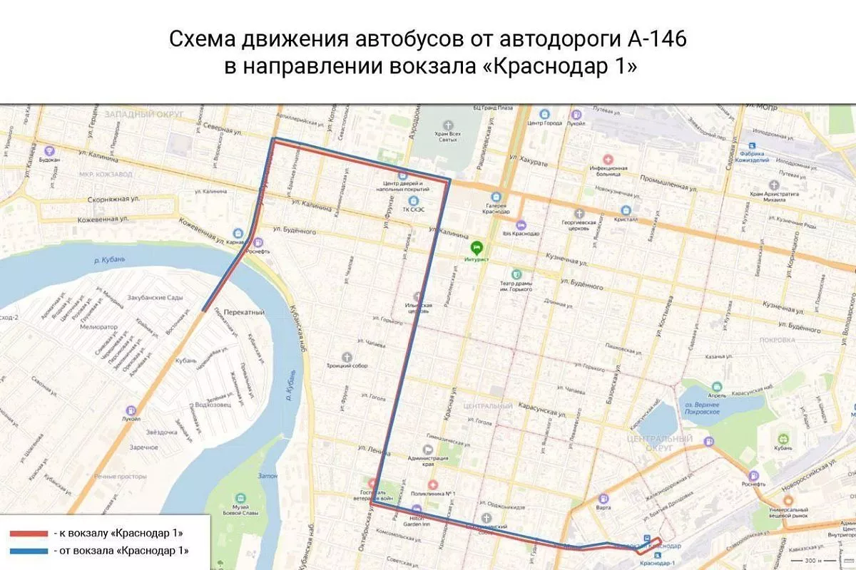 Для автобусов, следующих к вокзалу «Краснодар-1» от автодороги «Краснодар — Кропоткин — граница Ставропольского края» (со стороны «OZ МОЛЛа»), движение организуют по улицам Горячеключевской, Бородинской, им. Мачуги, Трамвайной, Ставропольская, им. Вишняковой, Переходной, им. Суворова, Мира.