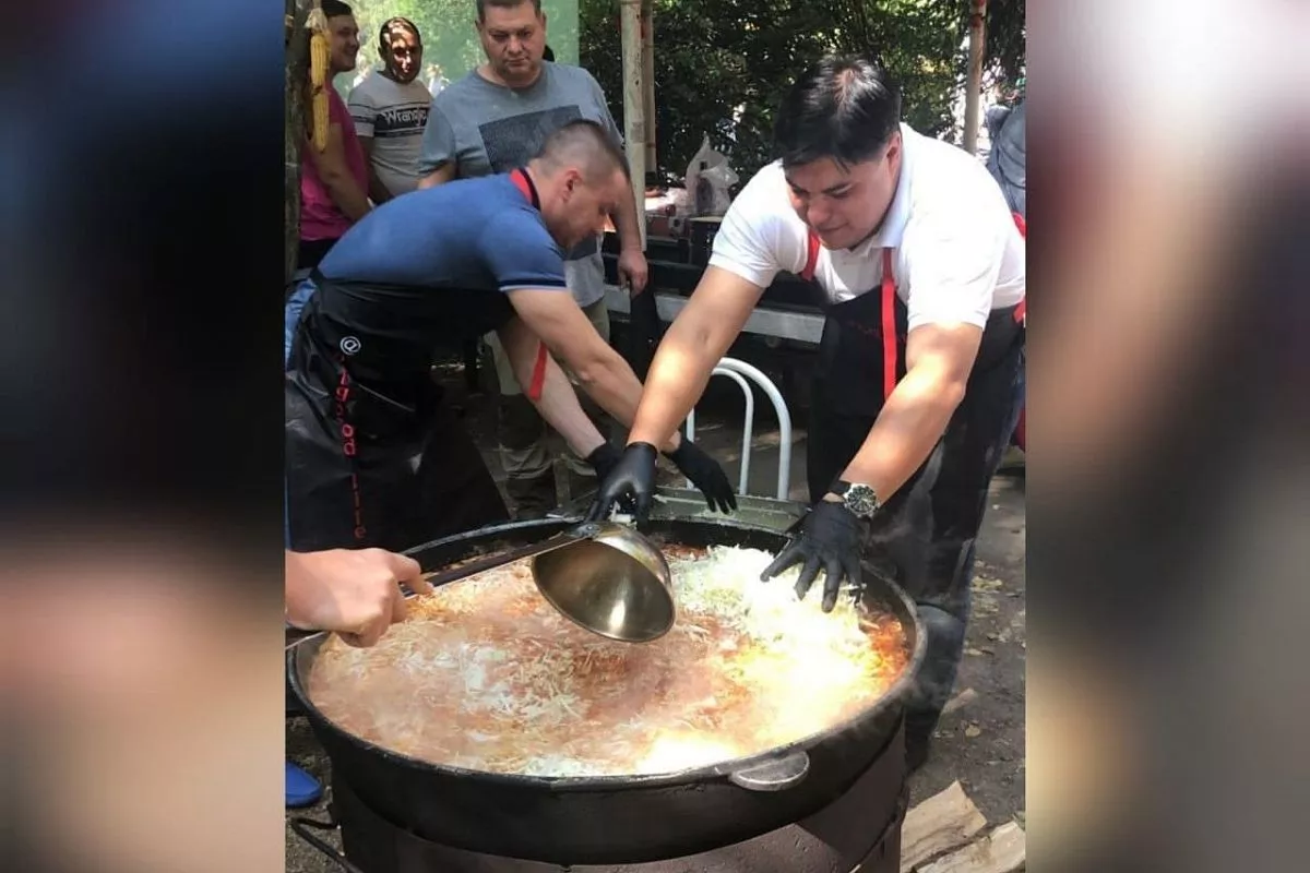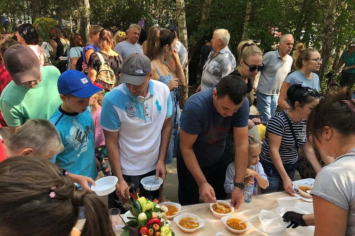 Праздник проходит в сквере Хуторском. Для гостей мероприятия приготовили угощения, главным блюдом стал борщ. 120 литров наваристого борща приготовил глава Пашковского сельского округа Всеволод Нетреба.