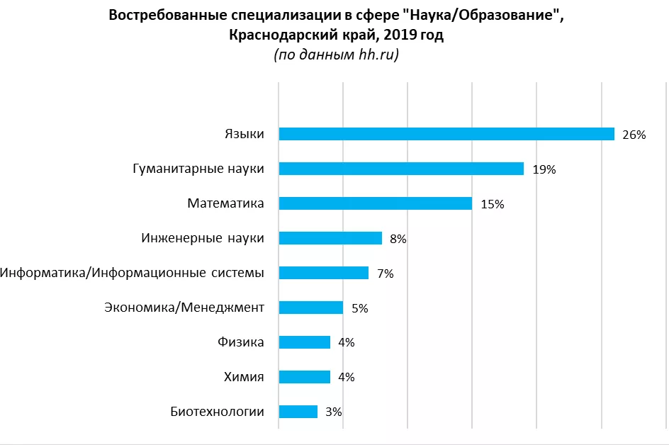 Оказалось, что больше остальных на Кубани востребованы преподаватели языков (26%), а также педагоги в области гуманитарных наук (19%) и математики (15%).