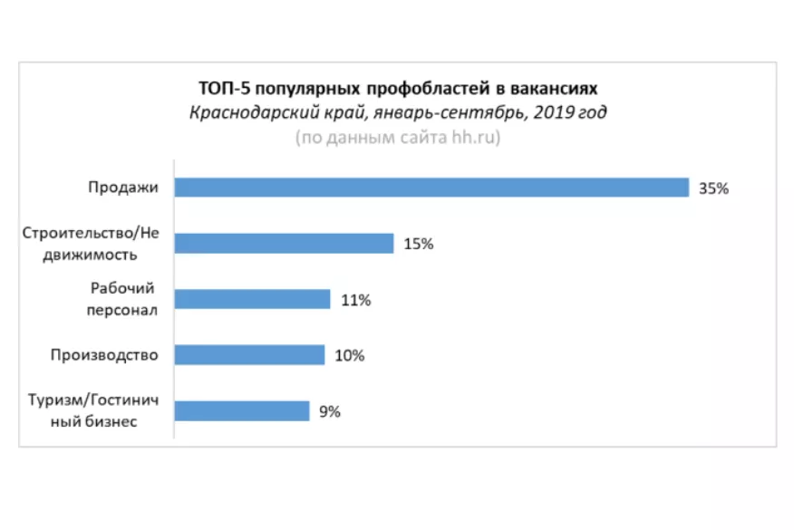По данным специалистов, на первом месте по востребованности у кубанских работодателей уже не первый месяц остаются специалисты сферы «Продажи» - 35 % от общего числа вакансий на hh.ru в регионе. Вторую строчку рейтинга занимает сфера «Строительство/Недвижимость» (15 %), на третьей – «Рабочий персонал» (11 %).
