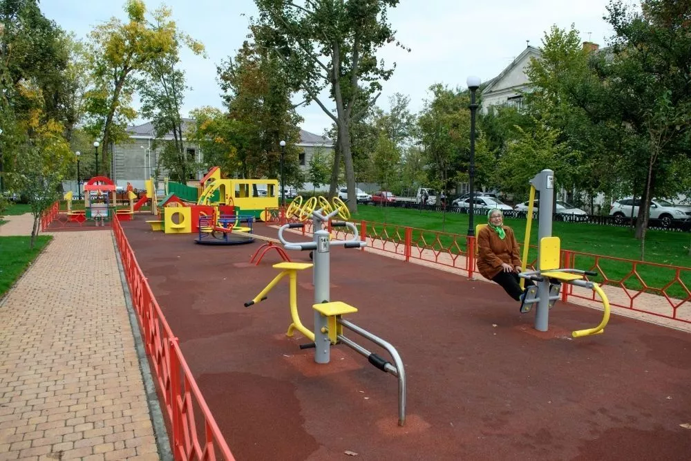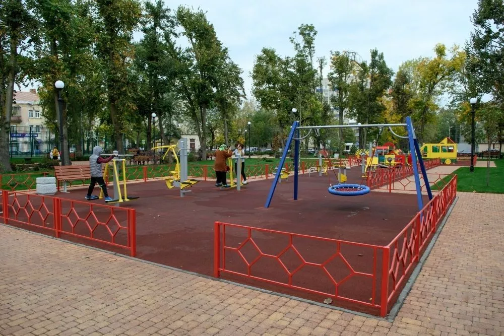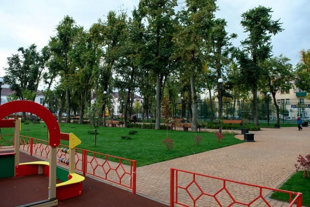 Здесь сделали две детские и три спортивные площадки, выложили плиткой тротуарные дорожки, установили новые лавочки, смонтировали систему освещения и автоматическую систему полива, камеры видеонаблюдения.