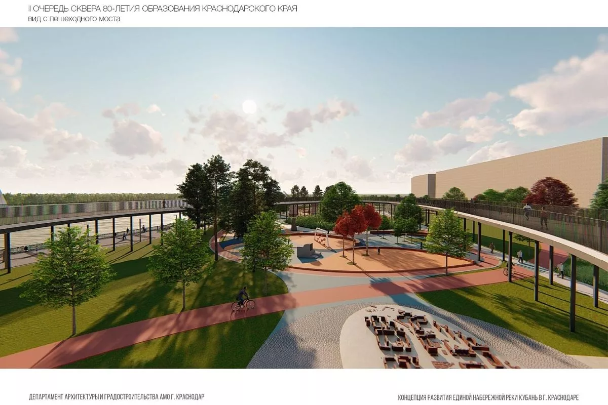 — Одной из «фишек» этого проекта является пешеходный мост, на который будет организован доступ инвалидов, — уточнила главный архитектор Краснодара. — Наша концепция заключается в том, что мы делаем многофункциональный парк, в котором будет сцена для выступлений, большая детская площадка. Также мы предусмотрели зону спорта — волейбольную и баскетбольную площадки.