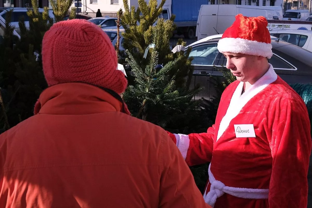 Елочные базары легко заметить, они украшены праздничными вывесками и световыми гирляндами. Покупателей встречают продавцы в костюмах Деда Мороза и Снегурочки.