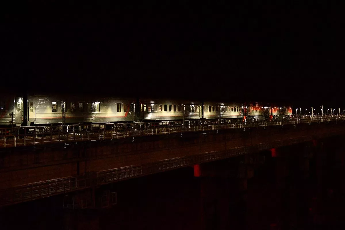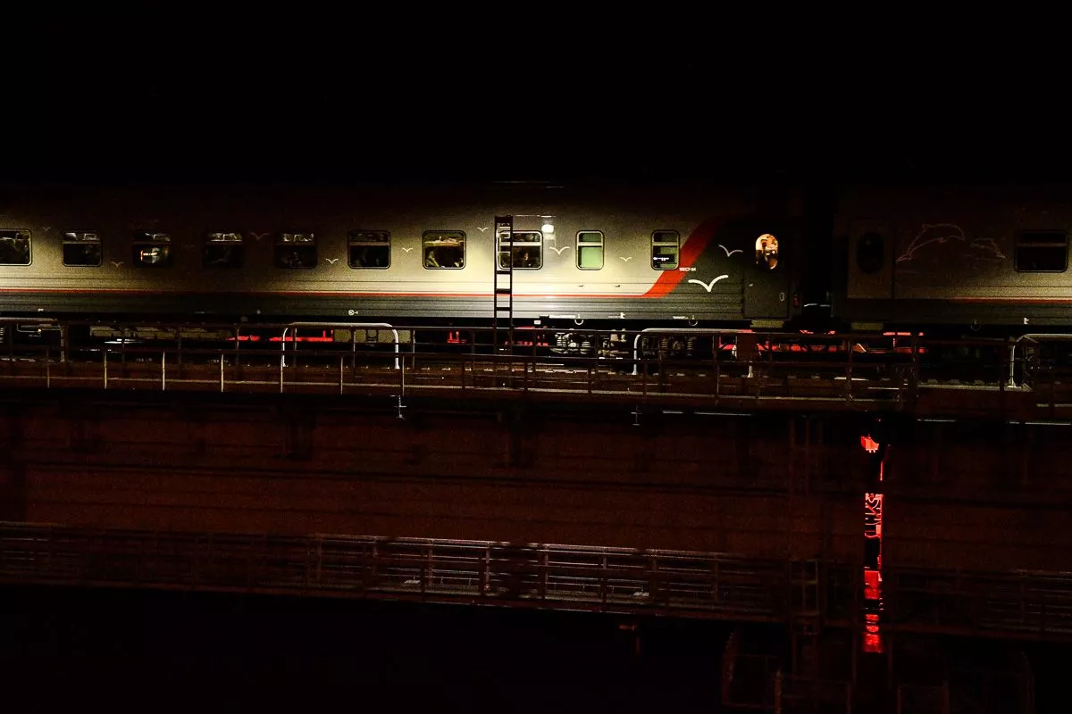 Поезд преодолел переправу примерно за 20 минут. Состав замедлил ход на мосту, чтобы пассажиры смогли разглядеть вид за окном, а наблюдающие за проездом состава — сфотографировать его, пишет РИА Новости.