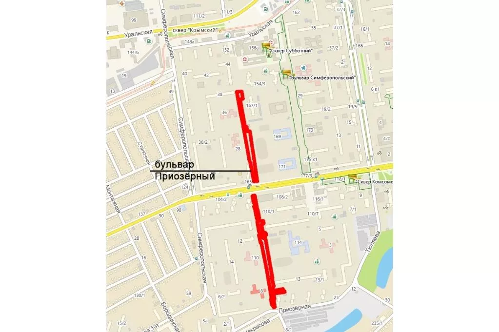Протяженность Приозерного бульвара — около 1 км от улицы Симферопольской № 38, 44 до улицы Приозерной, 9 (параллельно бульвару «Симферопольскому»).