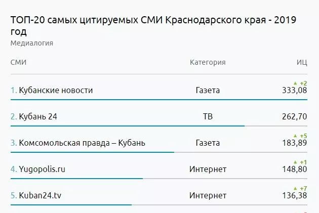 Отмечается также, что с 2018 года «Кубанские новости» поднялись в рейтинге на две позиции, «Комсомольская правда» - Кубань» прибавила пять строчек рейтинга.
