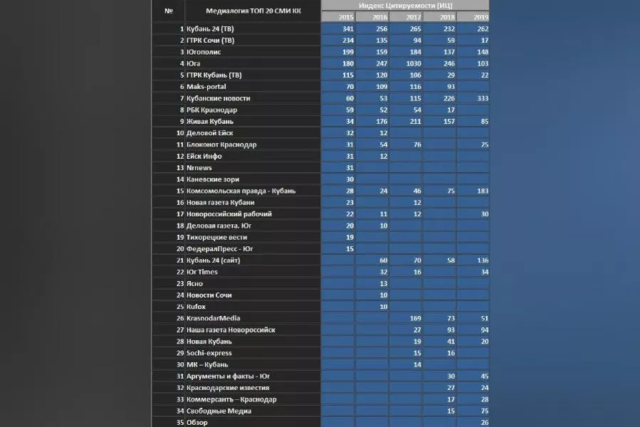 Социологи провели анализ и выяснили, что за пять лет в рейтинг «Медиалогии» попали 35 СМИ. Восемь из них были представлены в списке ежегодно: «Кубань 24», «ГТРК Сочи», «Югополис», «Юга.ру», «ГТРК Кубань», «Кубанские новости», «Живая Кубань», «Комсомольская правда – Кубань».