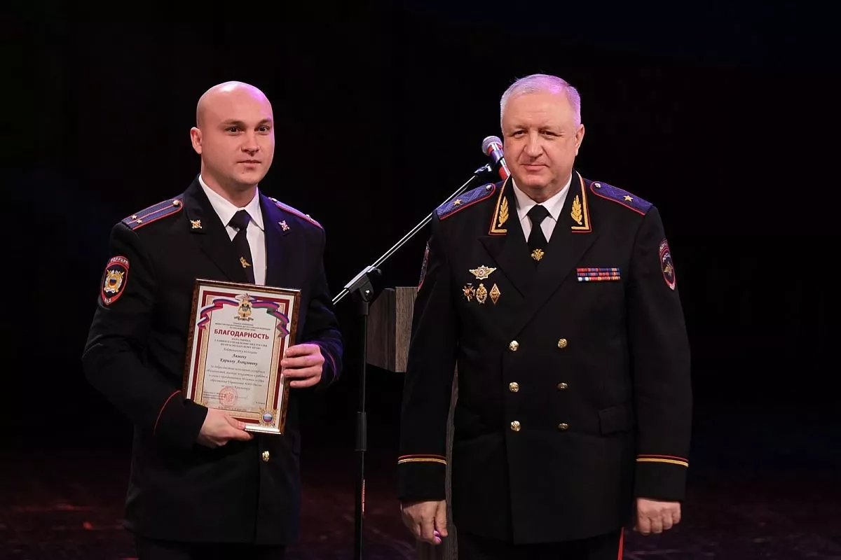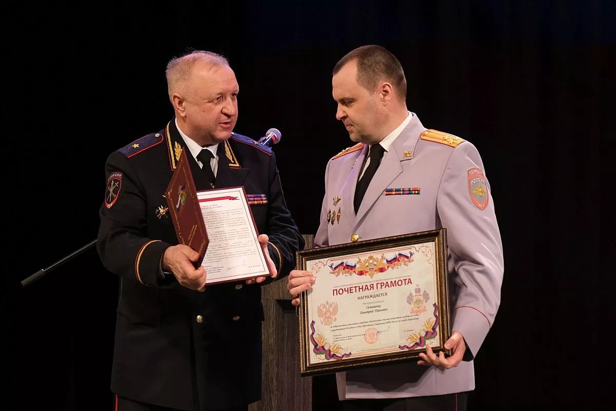 Начальник главка наградил за успехи в службе почетной грамотой ГУ МВД России по краю начальника УМВД России по Краснодару Дмитрия Остапенко, руководителей подразделений и отличившихся сотрудников управления, после чего с поздравлением выступили почетные гости.