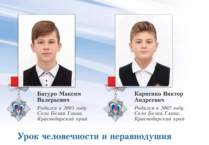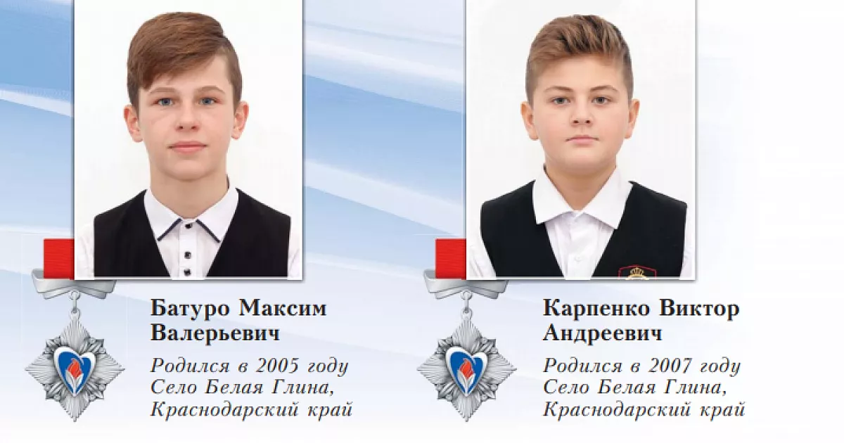 В министерстве образования, науки и молодежной политики края рассказали о кубанских лауреатах. Ими стали двое школьников из села Белая Глина Максим Батуро и Виктор Карпенко. В конце мая 2019 года они спасли ребенка из реки, который повредил руку и застрял в арматуре.