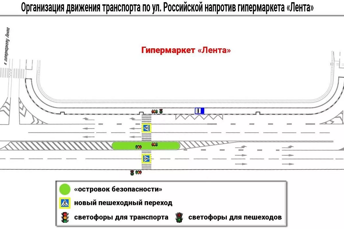 На пропускную способность этого участка новый пешеходный переход не повлияет — светофоры по улице Российской в районе «Ленты», а также на пересечении с переулком Гаражным и улицей Дунаевского будут работать синхронно.