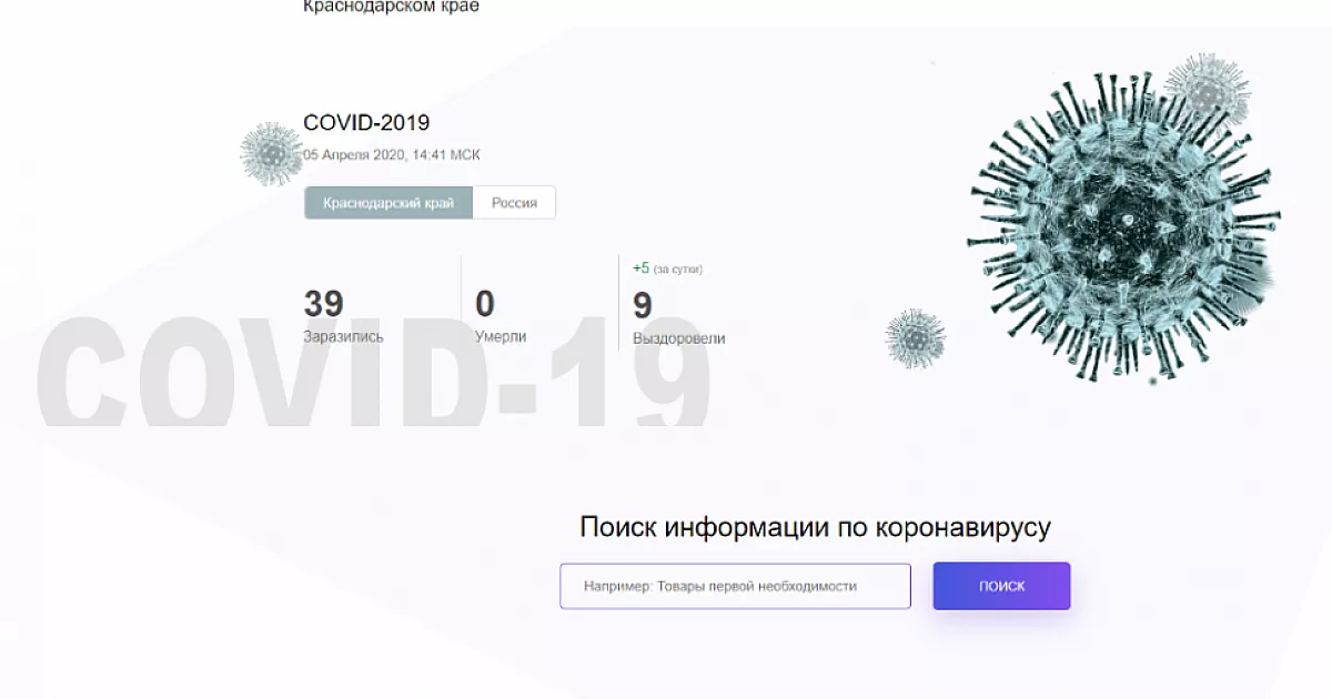 По состоянию на 5 апреля, на Кубани проведено 14 769 лабораторных исследований на COVID-19. Из них положительный результат был получен в 39 случаях. Пятеро больных находятся в тяжелом состоянии. Девять пациентов выписано с выздоровлением.