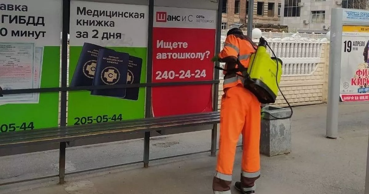 С утра дежурные бригады — 60 человек с ранцами, наполненными дезинфицирующей смесью, обрабатывают остановочные комплексы, а также подземные пешеходные переходы, лавочки на бульварах и в скверах, детские и спортивные площадки.