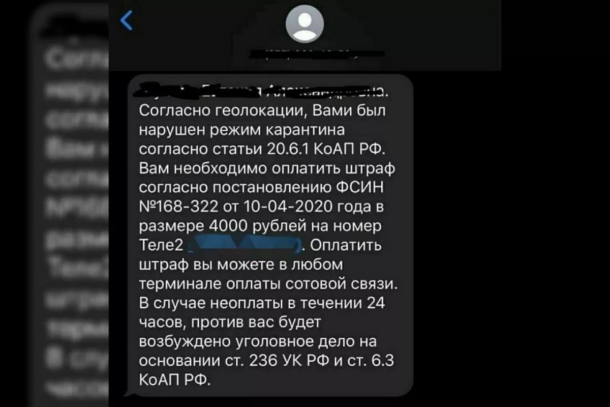 Зафиксированы случаи рассылки СМС-сообщений, в которых сообщается, что человек, согласно геолокации, якобы нарушил режим карантина и должен оплатить штраф в соответствии с постановлением ФСИН в размере 4000 рублей. При этом указывается номер телефона, на который необходимо перевести деньги. Далее следует угроза о возбуждении уголовного дела за неуплату штрафа