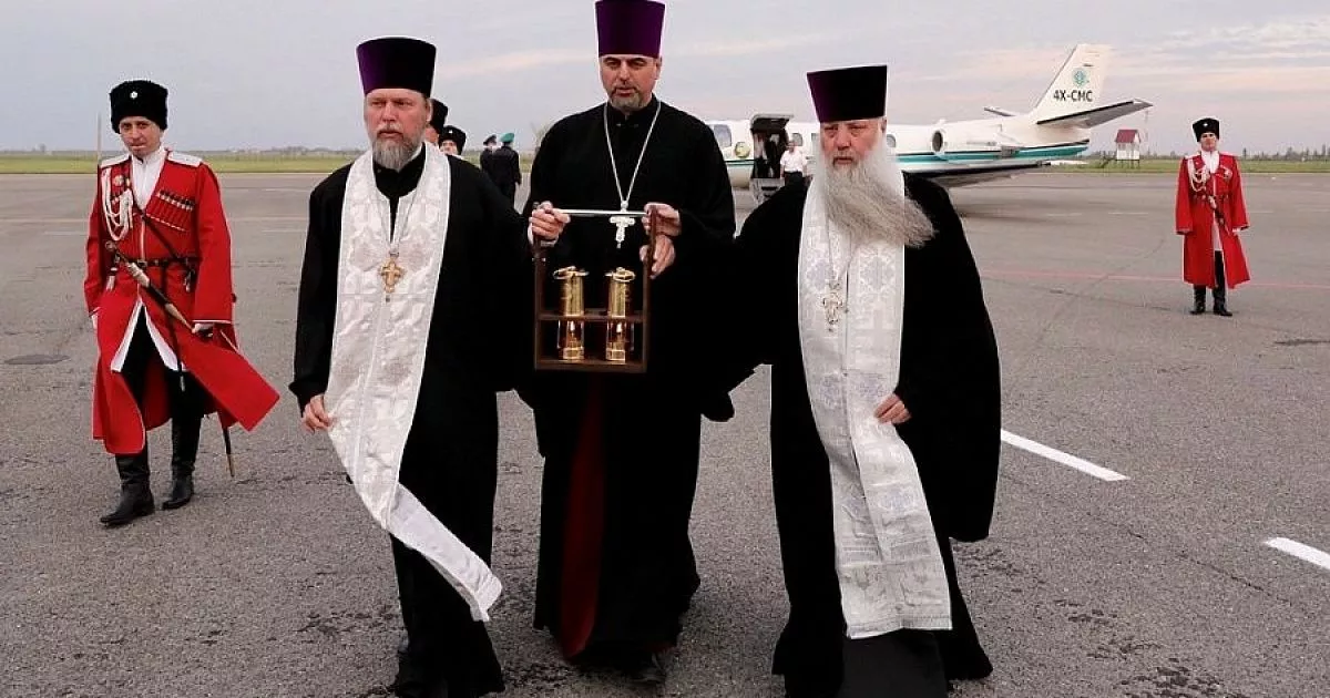 С трапа самолета огонь был передан священнослужителям Кубанской митрополии.