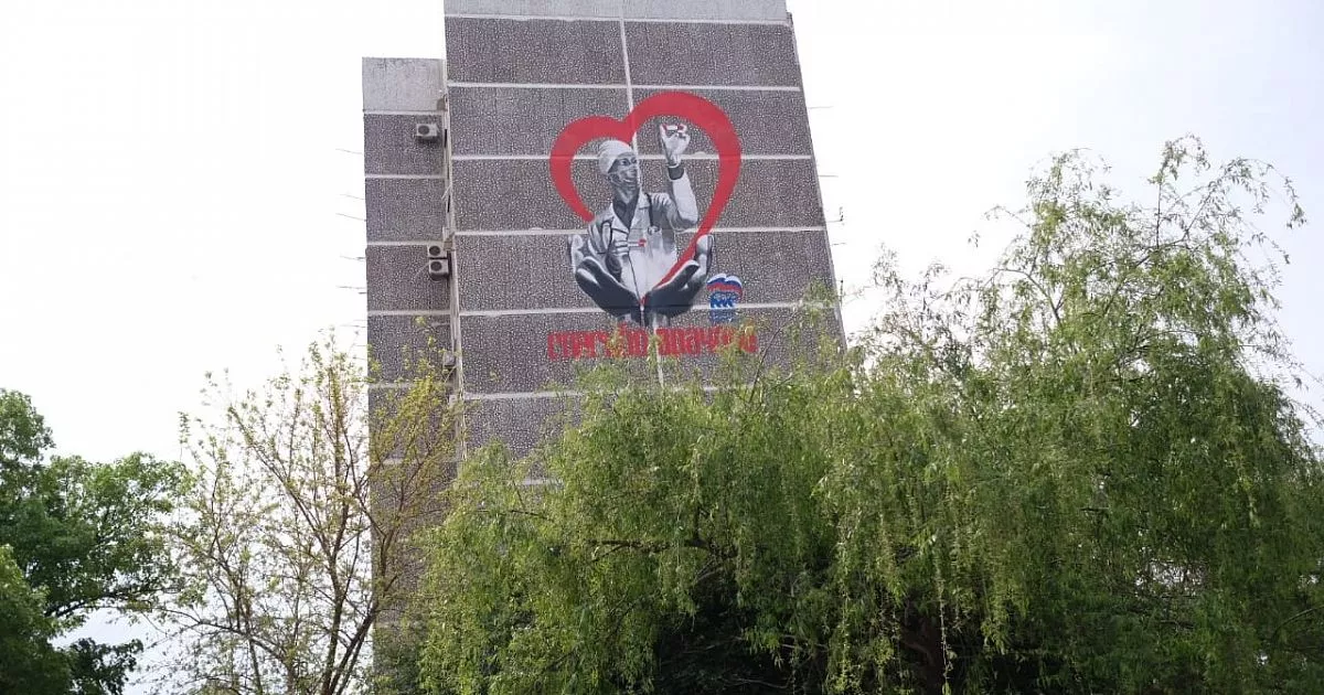 Благодарность медикам появилась на стене дома по адресу 1 Мая, 234.