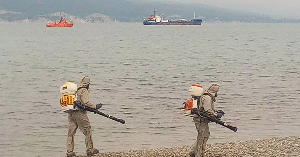 Специалисты в защитных костюмах не дезинфицировали гальку на новороссийском пляже, а обеззараживали объекты, находившиеся на набережной.
