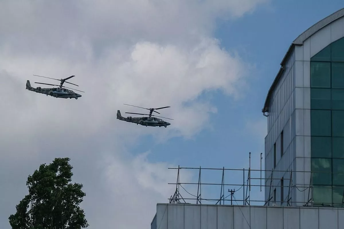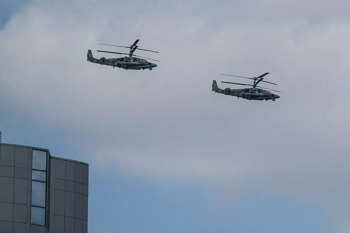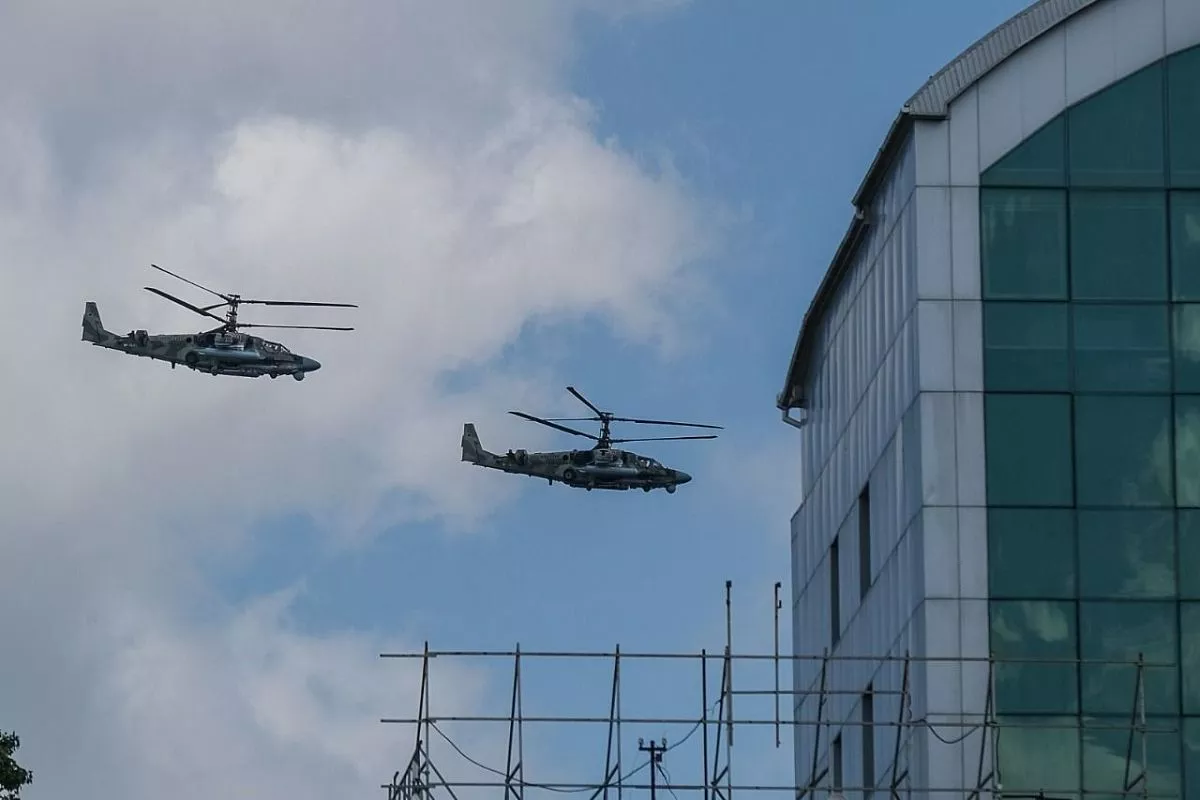 В небе над городом можно заметить военные самолеты и вертолеты.