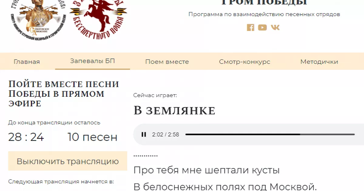 На сайте www.громпобеды.рус доступны тексты песен Победы, там же единовременно транслируется текст и звучит музыка.