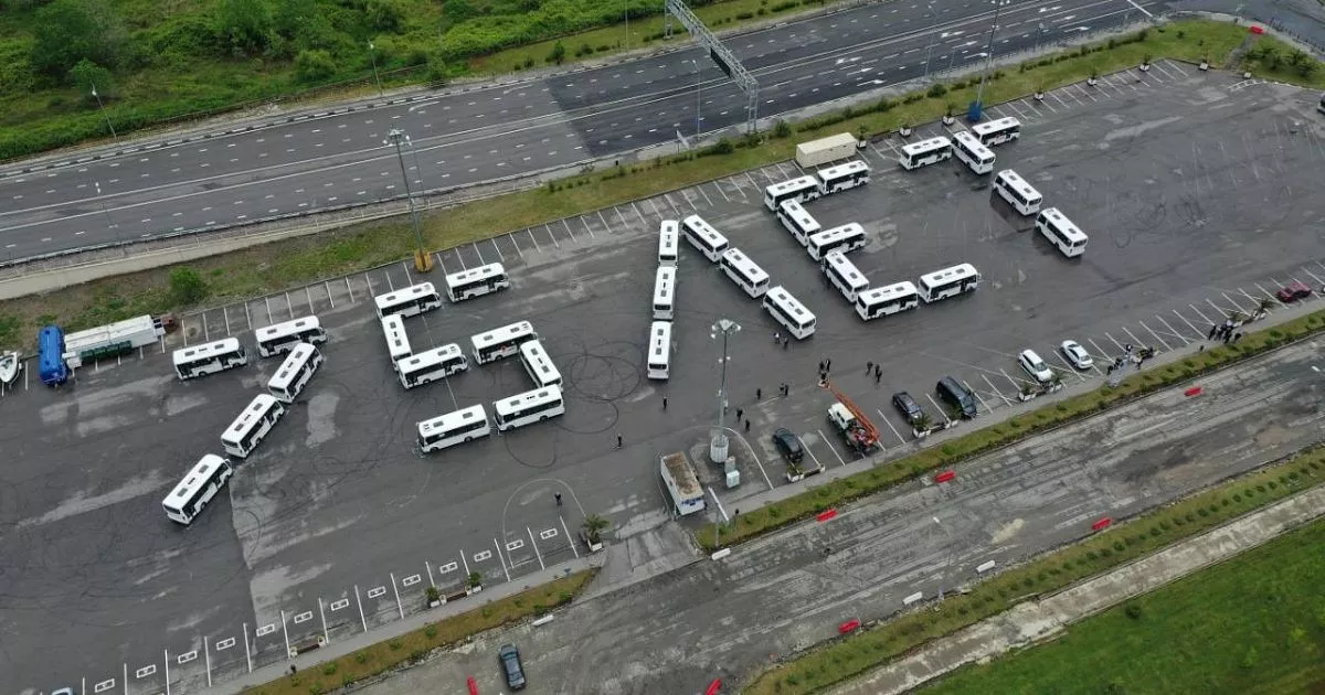 На парковке в Олимпийском парке в честь юбилея Великой Победы несколько десятков автобусов выстроились в виде фразы «75 лет».