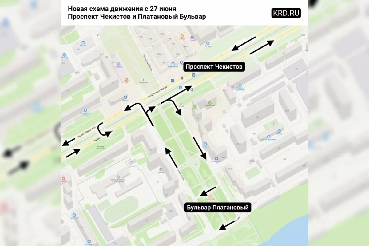 С 27 июня в районе проспекта Чекистов и ул. Платановый Бульвар заработает новая схема дорожного движения.