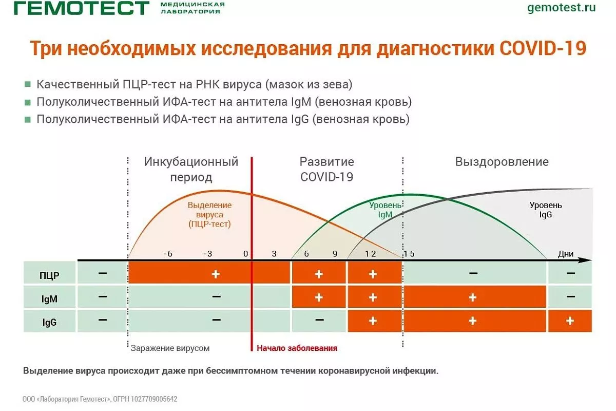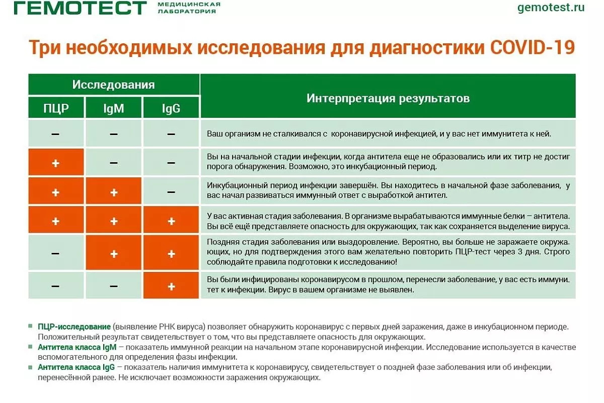 Из-за непредсказуемости коронавируса отдельные анализы при COVID-19 менее информативны, чем комплексная диагностика: с помощью трёх исследований можно не только выявить инфекцию на любой стадии, но и, сопоставив результаты, проверить, опасен ли человек для окружающих прямо сейчас. Результаты анализов на антитела IgM и IgG предоставляются в полуколичественном формате: на бланке результатов будет указан «коэффициент позитивности» – это числовое значение, по которому можно понять, идёт ли инфекция на спад или продолжает развиваться.