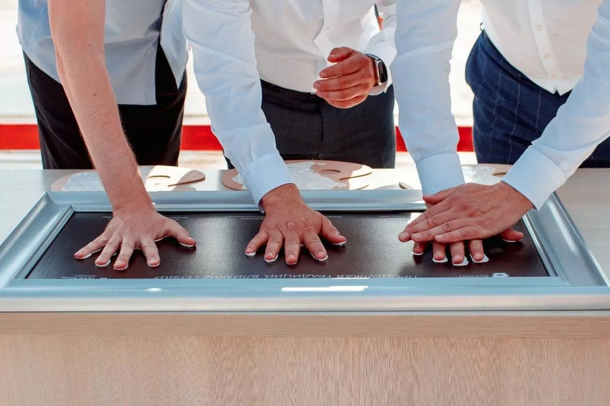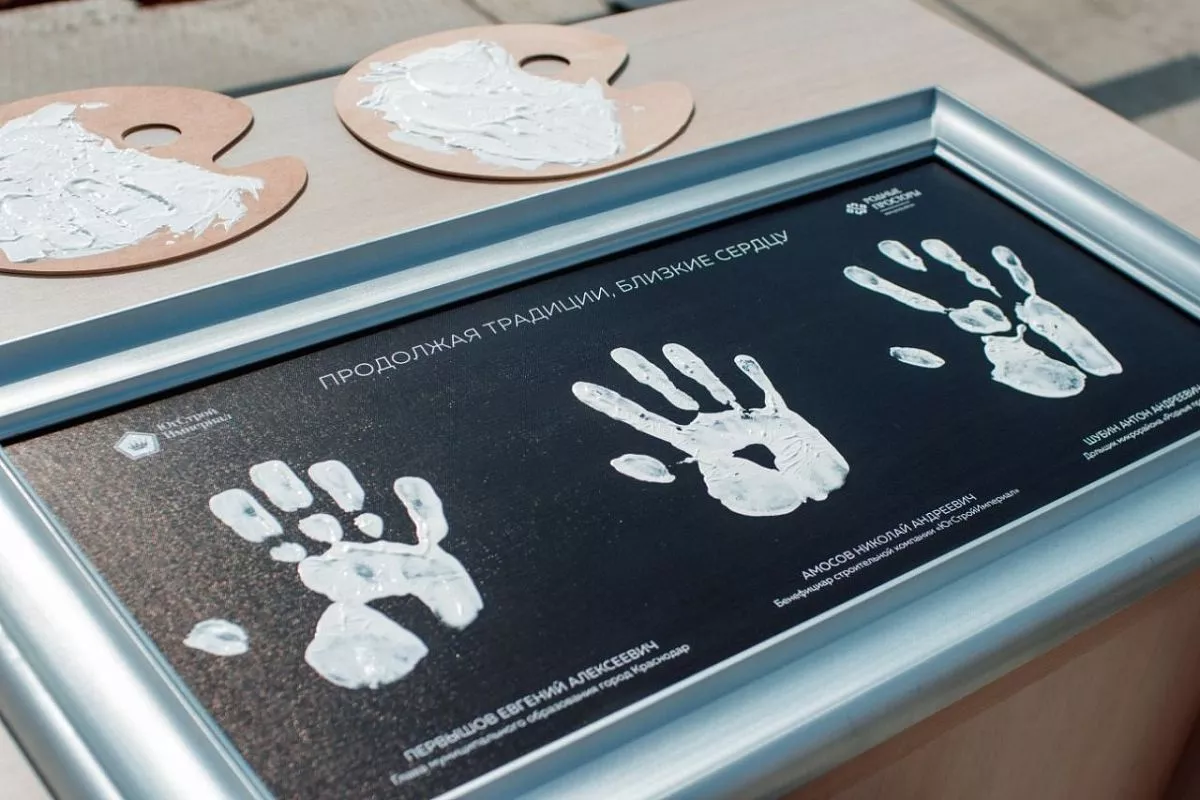 Первый дольщик микрорайона «Родные просторы» Антон Шубин вместе с главой краевого центра и бенефициаром компании «ЮгСтройИмпериал» принял участие в церемонии начала строительства детского сада и оставил отпечаток ладони на символичном холсте.