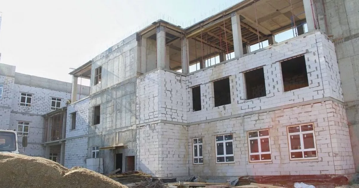 Школа готова только на 58%. Практически завершена коробка здания. Кровля и внутренние инженерные системы обустроены на 30%. На объекте работает 110 человек.