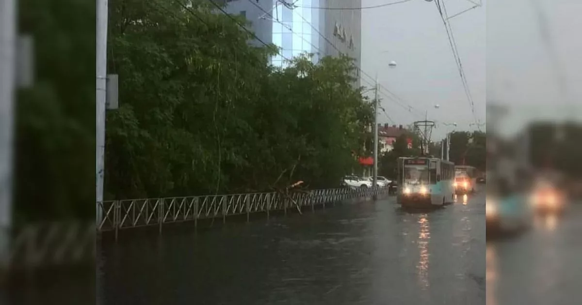 Из-за сильного ливня в краевой столице практически парализовано движение электротранспорта.