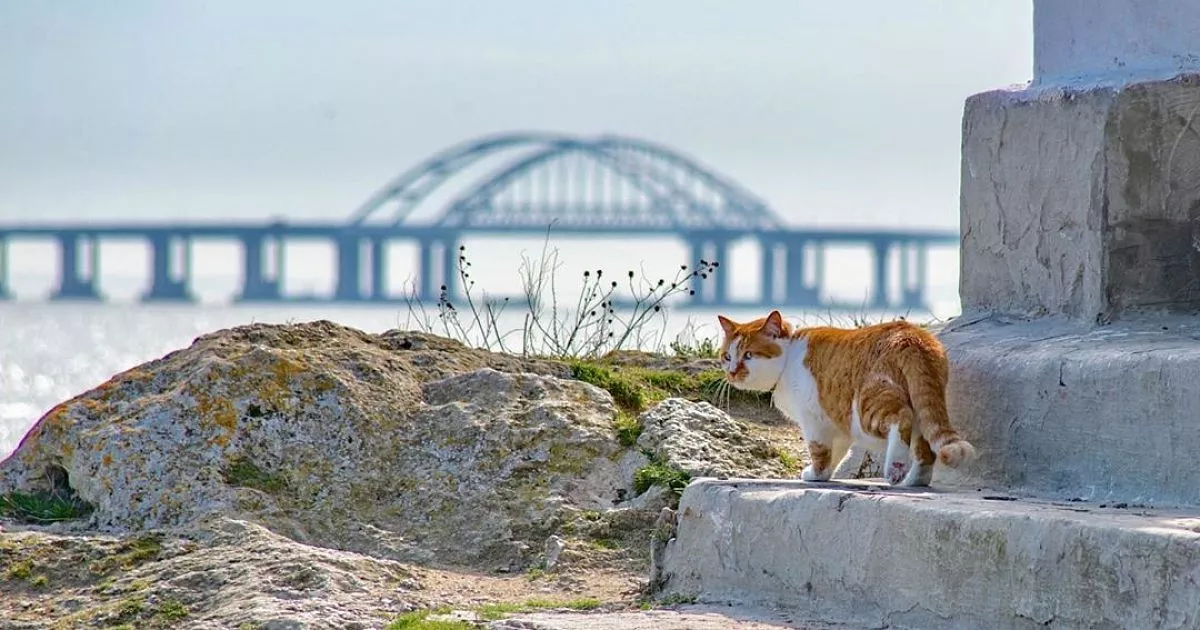 Любимец строителей Крымского моста и официальный символ его возведения кот Мостик переезжает.