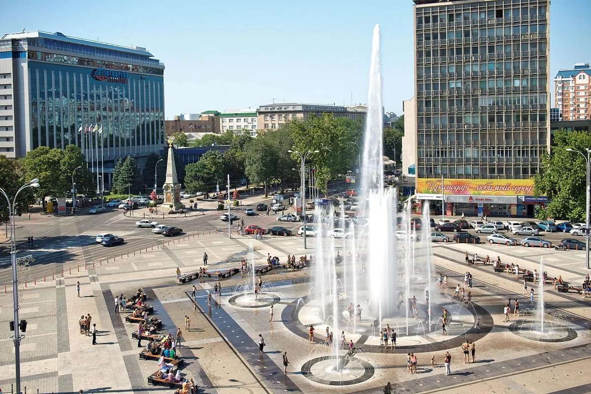 Краснодарский музыкальный фонтан занимает площадь более 1200 кв. м. На глубине 4 метра спрятана насосная станция, которая подает воду под высоким давлением, что позволяет струям подниматься до 25 метров в высоту.