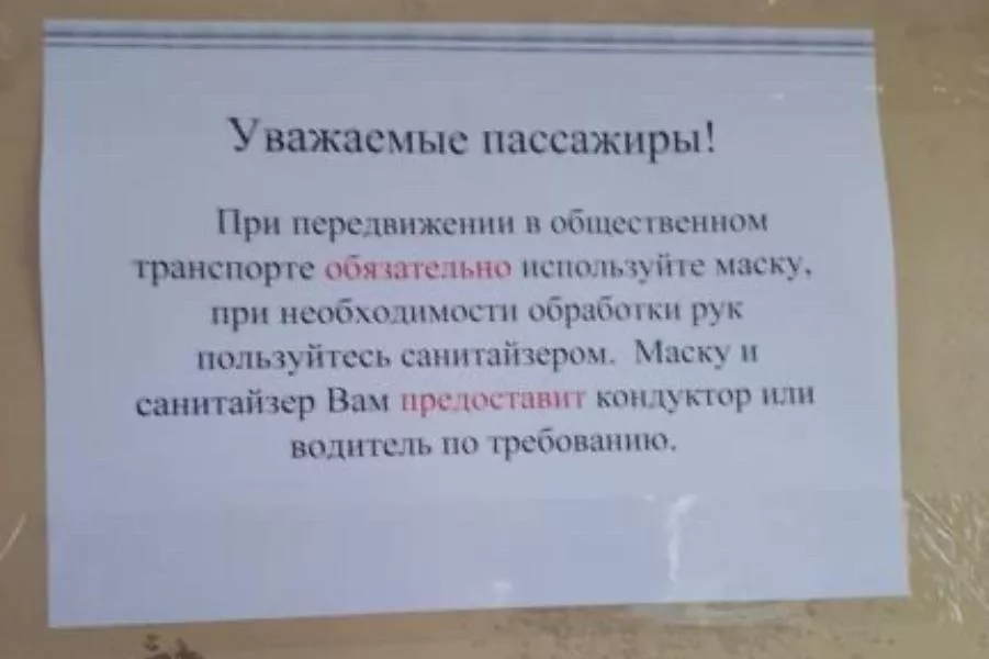 Первыми выполнять распоряжение властей стали сотрудники Краснодарского трамвайно-троллейбусного управления. Утром 13 августа в салонах общественного транспорта появились объявления, информирующие пассажиров о том, что маску и санитайзер можно получить у кондуктора или водителя.