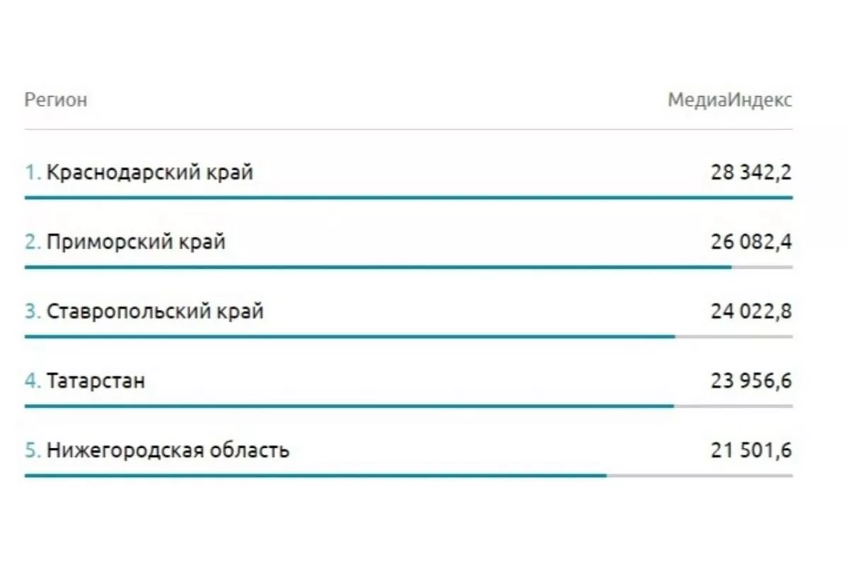 Лидерами медиарейтинга стали Краснодарский край, Приморский край и Ставропольский край.