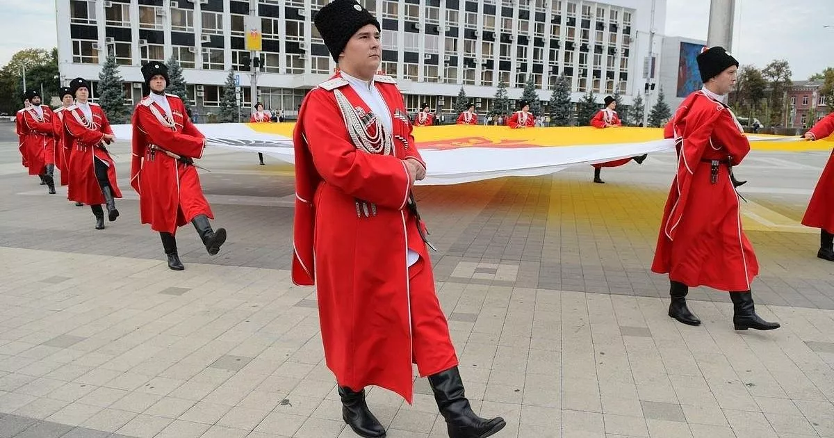 Флаг города на флагшток подняли казаки почётного караула Кубанского казачьего войска под звуки гимна города в исполнении Русского вокально-хореографического ансамбля «Родник».