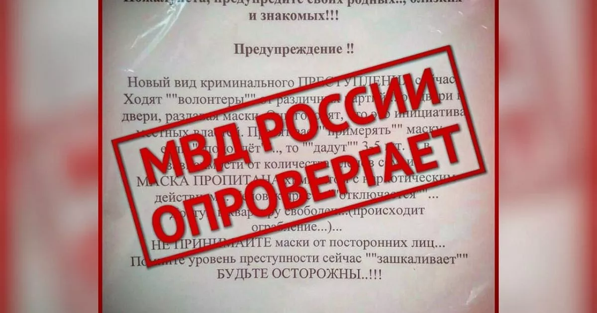 В ряде регионов через мессенджеры распространяется информация о том, что по квартирам ходят «волонтеры» и раздают маски, пропитанные наркотическим средством. При их примерке человек теряет сознание и в это время происходит ограбление.