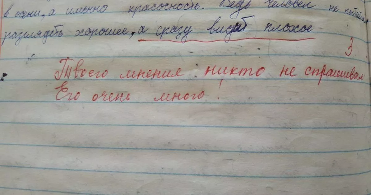 Накануне в ряде СМИ, а также в социальных сетях появилась фотография, на которой запечатлен комментарий учителя, оставленный под сочинением школьника. В замечании педагога было написано: «Твоего мнения никто не спрашивал. Его очень много».