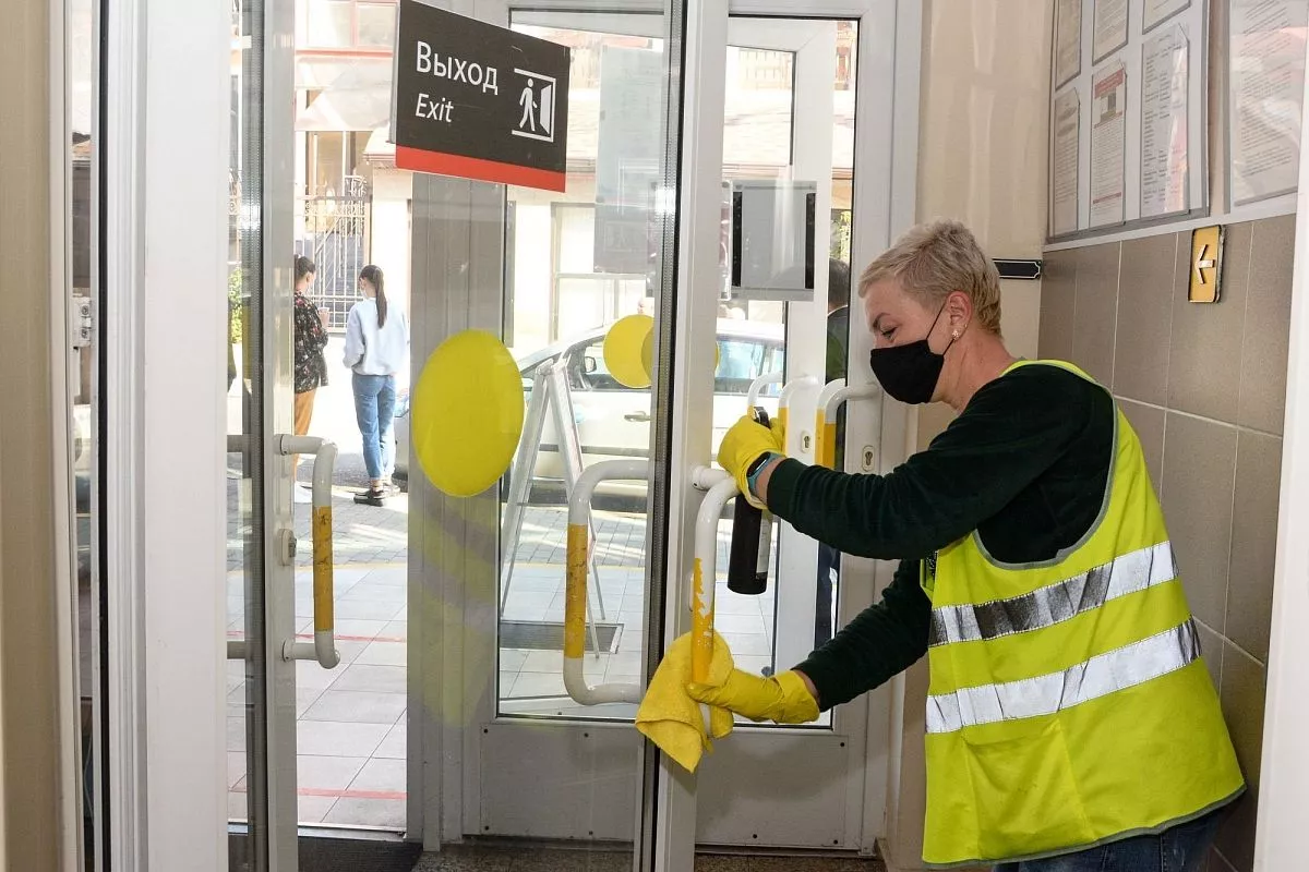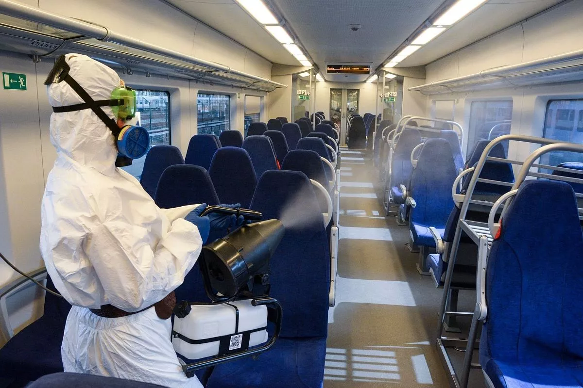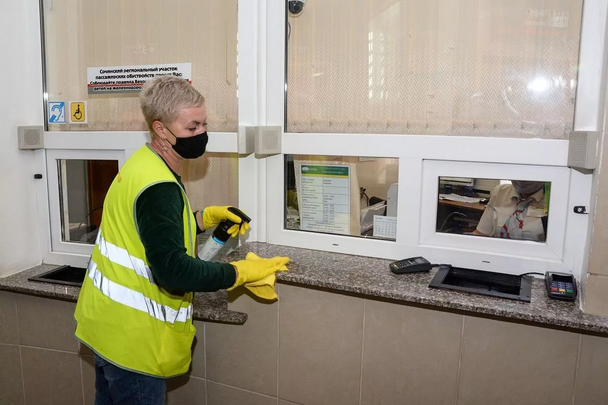 Санитарная обработка помещений проводится ежечасно. С помощью специальных обеззараживающих моющих средств сотрудники дезинфицируют двери, ручки, скамейки, подоконники, стекла, стены, а также платформы и поезда.