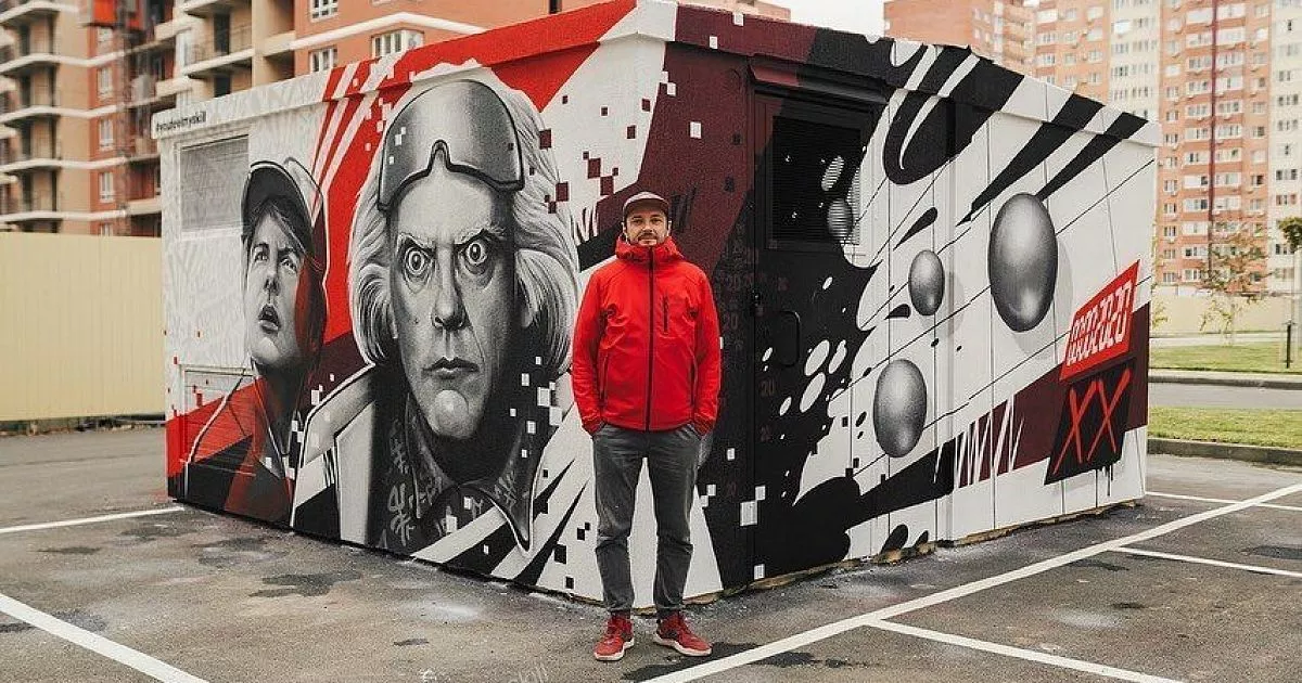 Художник Ян Кузьмин создал в Краснодаре граффити с изображением героев легендарной трилогии «Назад в будущее» Доктора Брауна и Марти Макфлая.