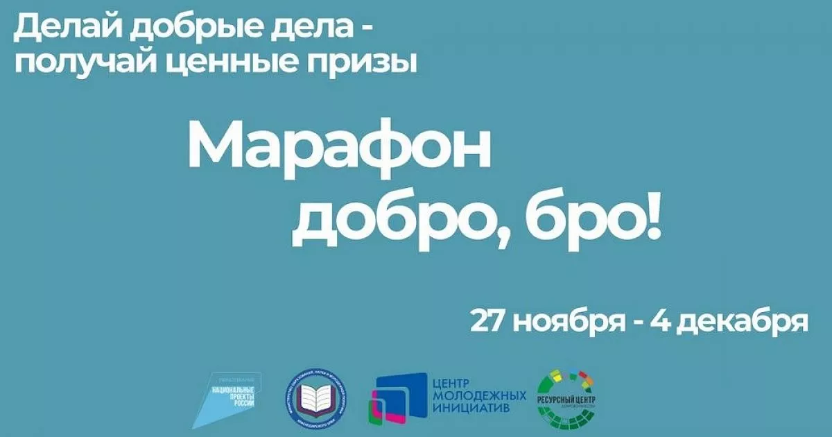 Марафон «Добро, бро!» приурочен к Международному дню добровольца. Акция пройдет с 27 ноября по 4 декабря в рамках регионального проекта «Социальная активность» нацпроекта «Образование».