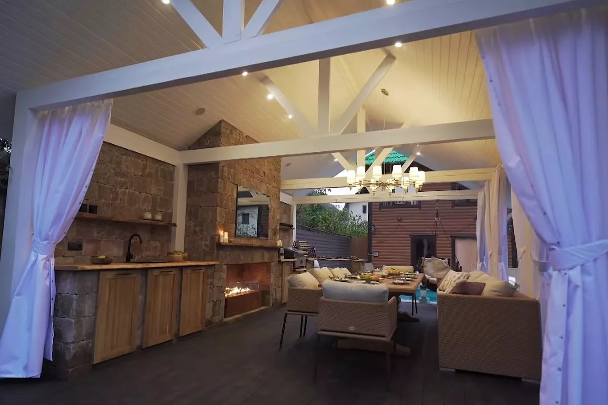 В рамках программы дизайнеры обустроили беседку, объединив ее с зоной бассейна. На территории беседки установили уличный камин, зеркальный телевизор и авторскую мебель.