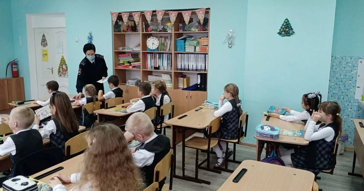Дорожные полицейские разъясняют школьникам, что сегодняшние погодные условия требуют большого внимания от всех участников дорожного движения.