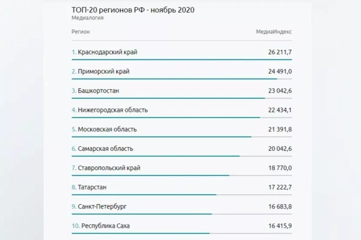 Лидерами медиарейтинга стали Краснодарский край, Приморский край и Республика Башкортостан.