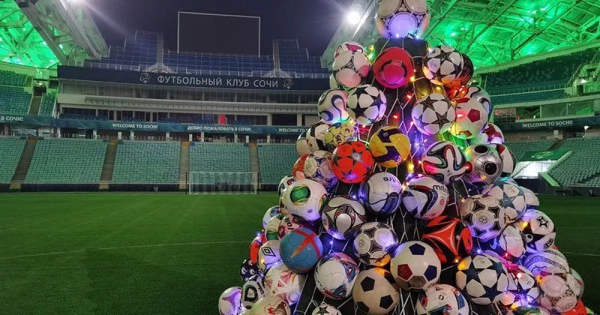 Она установлена в центре футбольного поля на стадионе «Фишт» в Сочи. Уникальность елки заключается в авторской концепции и раритетных украшениях. Новогодний атрибут покрыт 258 футбольными мячами разных моделей.
