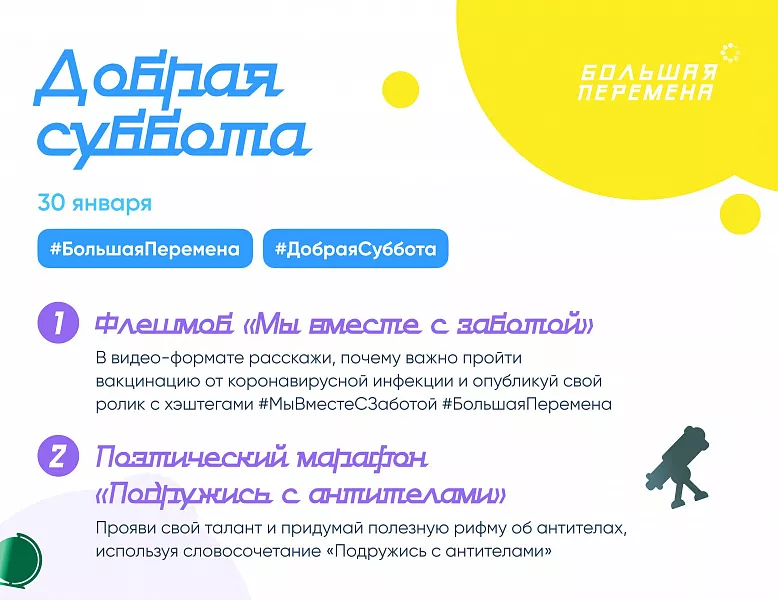 Фото и видеоматериалы проведенных мероприятий школьники смогут опубликовать в своих социальных сетях и сообществе конкурса «Большая перемена» с хэштегами #ДобраяСуббота и #БольшаяПеремена
